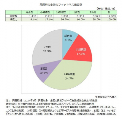 また、施設を業態別に分類すると、総合型が1,142施設、小規模型が2,145施設、24時間型が4,348施設、ヨガ型が1,334施設、その他が3,574施設であった。