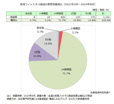 2024年8月時点での全国フィットネス施設12,543施設のうち、新規のフィトネス施設数(2023年9月~2024年8月にオープンした施設)は1,152施設であった。新規施設を業態別に分類すると、総合型が8施設、小規模型が24施設、24時間型が826施設、ヨガ型が124施設、その他が170施設になった。
