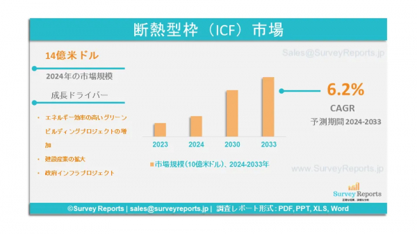 Surveyreportsの専門家は、断熱コンクリートフォーム(ICF)市場の調査分析を行い、2024年に生成された断熱コンクリートフォーム(ICF)市場規模は14億米ドルに達したことを発見した。さらに、断熱コンクリートフォーム(ICF)市場のシェアは、2033年末までに25億米ドルに達すると予測されている。断熱コンクリートフォーム(ICF)市場は、2024年から2033年の予測期間にわたって、年間平均成長率(CAGR)約6.2%で成長すると予測されている。