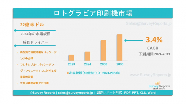 Surveyreportsの専門家は、グラビア印刷機市場の調査を分析し、2024年にグラビア印刷機市場規模が22億米ドルに達すると予測した。さらに、グラビア印刷機市場のシェアは、2033年末までに31億米ドルに達すると予測されている。グラビア印刷機市場は、2024年から2033年の予測期間中に、年間平均成長率(CAGR)約3.4%で成長すると予測されている。
