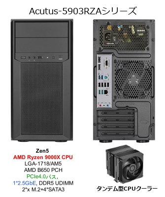 Acutus-5903RZAシリーズは、LGA1718ソケット(ソケットAM5)対応のZen5 AMD Ryzen 9000X CPUを搭載したワークステーションで、2基の5.25インチベイ、各2基の3.5インチと2.5インチドライブベイを装備し、全面のメッシュパネルとシステム前後の12cmファンにより、良好な換気能力を備えています。