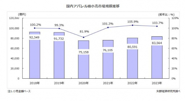 2023年の国内アパレル総小売市場規模(紳士服・洋品、婦人服・洋品、ベビー・子供服・洋品計)は前年比103.7%の8兆3,564億円で3年連続で前年を上回った。