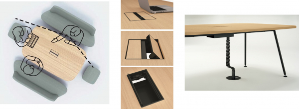 配線口は高い意匠性とスムーズな動作性を兼ね備えた、天板と一体化する開閉配線蓋タイプで、配線口付テーブルはチームでの終日利用にも最適です。美観に配慮したケーブルガイドもご用意しています。