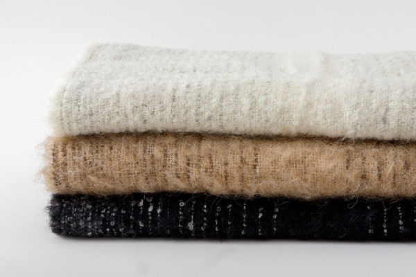 アルパカとウールの2本の糸を撚り、1本の糸をループ状にしています。織ったあと起毛させボリュームを出していますので、大判ながらも軽く仕上げ、あたたかく包み込んでくれます。