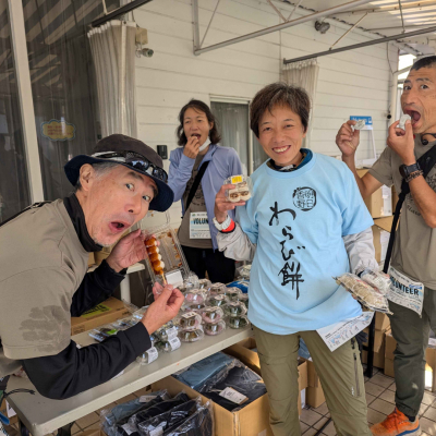 明日香野は西日本地域で販売中の「秋のわらび大福」、「大人の団子(三色・よもぎ使用)」、「ごまだんご」などをエイドでふるまい、選手を後押ししました。