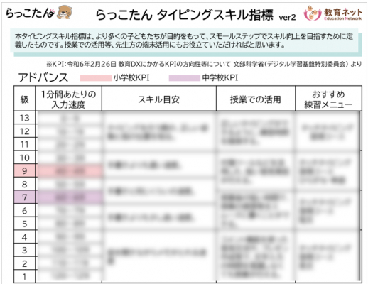 また、入力速度による26段階の級・段ごとに、授業内の活用イメージや『らっこたん』のおすすめ練習メニューなども記載しています。