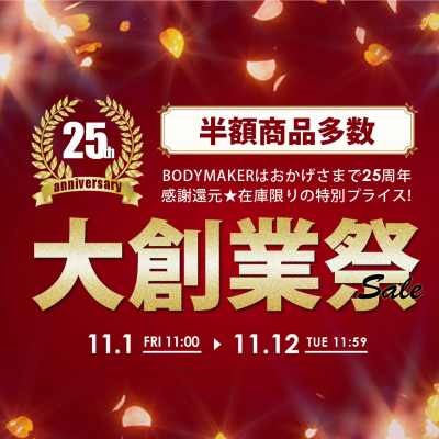 創業以来大変お世話になっているお客様のおかげだと従業員一同深く感謝を申し上げます。BODYMAKERは1999年の創業当初よりトレーニング・格闘技用品の総合メーカーとして多くの格闘家・トレーニーの方にご愛顧いただいております。今年も創業25周年を記念し、お客様への感謝の想いを込めてスペシャルなセール「大創業祭」を直販サイト・直営店舗とも同時開催いたします。目玉商品を一部紹介すると シーズン到来ウィンターブーツ¥8,000→¥3,990、ウォームシューズ EG¥4,180→¥2,090、人気のあったかインナー BM・WARMGEARロングスリーブ¥3,300→¥1,650など、うれしい半額商品多数。他にも期間中、新作ウェアやトレーニング・格闘用品も期間限定スペシャルプライスで販売致します。ぜひこの機会にご利用ください。