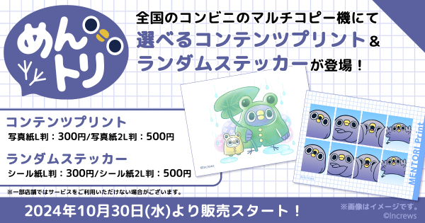株式会社インクルーズ(東京都渋谷区、代表取締役社長 山﨑 健司)は、10月30日(水)より、日本全国のコンビニエンスストア店内のマルチコピー機を中心に、気軽にプリントできる「インクルーズプリント by eプリントサービス」を開始した事と、その記念すべき第1弾として、LINEスタンプ「面倒だがトリあえず返信」から生まれた株式会社インクルーズのオリジナルIP「めんトリ」のコンテンツプリントとランダムステッカーが販売開始したことをご報告させていただきます。