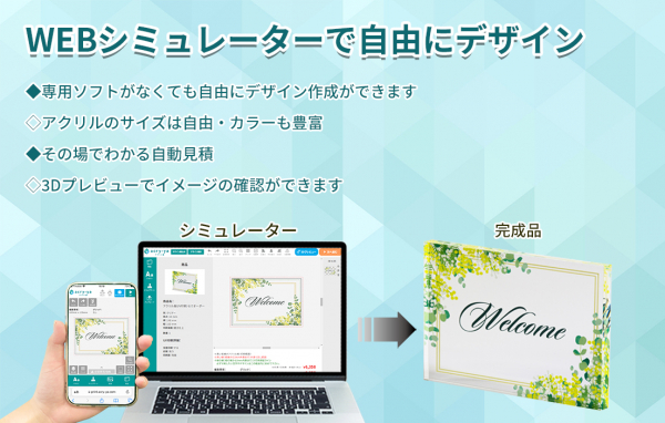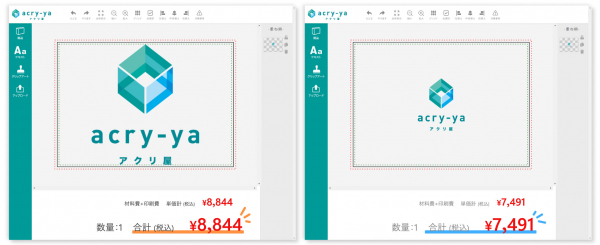 入稿シミュレーターなら、専用のソフトが無くてもPC、スマホから簡単にデザインデータ作成ができます。会員登録不要でご利用頂けます。アクリル板の価格はもちろん、印刷費は印刷範囲の大小で変わり、自動見積にてその場でご確認いただけます。