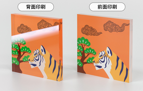 UVインクジェット印刷は艶消し調の印刷となる為、表からの場合印刷部に反射は起きづらく、背面から印刷をすると艶のある仕上がりに。デザインにより好みの印刷面をご選択いただけます。