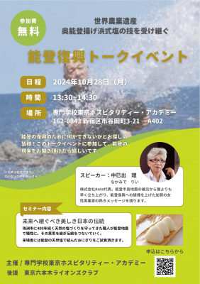 「能登震災で犠牲になった、珠洲市に400年続く天然の塩づくりの職人・前賢一さんの意思を継ぎ伝統を繋いで行きたい」と願うこのイベントは、専門学校東京ホスピタリティー・アカデミー(東京都新宿区)学園祭の一環として行われ、参加者には、生徒自らがご飯を炊いて作ったおむすびに、珠洲市の天然塩を使った塩むすびが振舞われました。