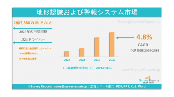 Surveyreportsの専門家は、地形認識および警報システム市場の調査を分析し、2024年に生成された地形認識および警報システム市場規模は2億7580万米ドルであった。さらに、地形認識および警報システム市場のシェアは、2033年末までに4億5520万米ドルの収益に達すると予測されている。地形認識および警報システム市場は、2024年から2033年の予測期間にわたって、年間平均成長率(CAGR)約4.8%で成長すると予測されている。
