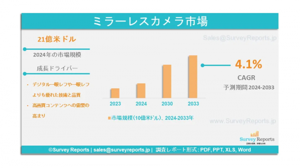 Surveyreportsの専門家は、ミラーレスカメラ市場の調査を分析し、2024年にミラーレスカメラ市場規模が21億米ドルに達すると予測した。さらに、ミラーレスカメラ市場のシェアは、2033年末までに35億米ドルの収益に達すると予測されている。ミラーレスカメラ市場は、2024年から2033年の予測期間中に、年間平均成長率(CAGR)約4.1%で成長すると予測されている。