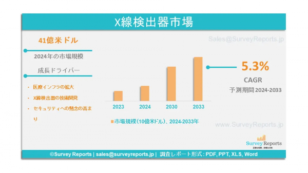 Survey Reports LLCは、2024年10月に調査レポートを発行したことを発表した。X線検出器市場は、タイプ別(フラットパネル検出器、コンピューテッドラジオグラフィ検出器、ラインスキャン検出器、電荷結合素子検出器)、パネルサイズ別(小面積、大面積)、技術別(間接変換、直接変換)、可搬性別 (固定式検出器、携帯式検出器)、用途別(医療用途、歯科用途、セキュリティ用途、獣医用途、産業用途)、エンドユーザー別(病院、診断ラボ、OEM、クリニック、ICU) - 2024年から2033年までの世界市場分析、動向、機会、予測を提供する。X線検出器市場の予測評価を提供する。X線検出器市場の成長促進要因、市場機会、課題、脅威など、いくつかの主要な市場力学に焦点を当てている。
