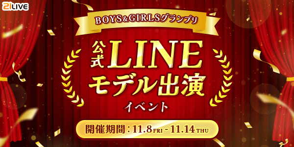 株式会社エムアンドティーティー(本社:沖縄県北谷町、代表取締役:井藤 三知子)が運営するエンターテイメント・ライブ配信アプリ【21LIVE(ニーイチライブ)】URL: https://21.live では、11月8日(金)より男女別ランキング『BOYS & GIRLSグランプリ決定戦』を開催。総合ランキング上位者には公式LINEモデルの出演権を進呈いたします。