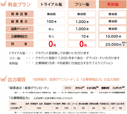 各種検索エンジンを使った企業情報の検索・収集は今や当たり前のように行われています。しかし検索エンジンの結果一覧には、広告やブログ等目的外の情報も混在し、欲しいサイトをなかなか見つけられないことも多いかと思います。そして見つけた目的の企業リンクから企業サイトに、さらに会社情報ページを探し、住所や電話番号をコピー&ペーストする、Web情報収集においてはこういったとても面倒な作業をこれまで伴っていました。