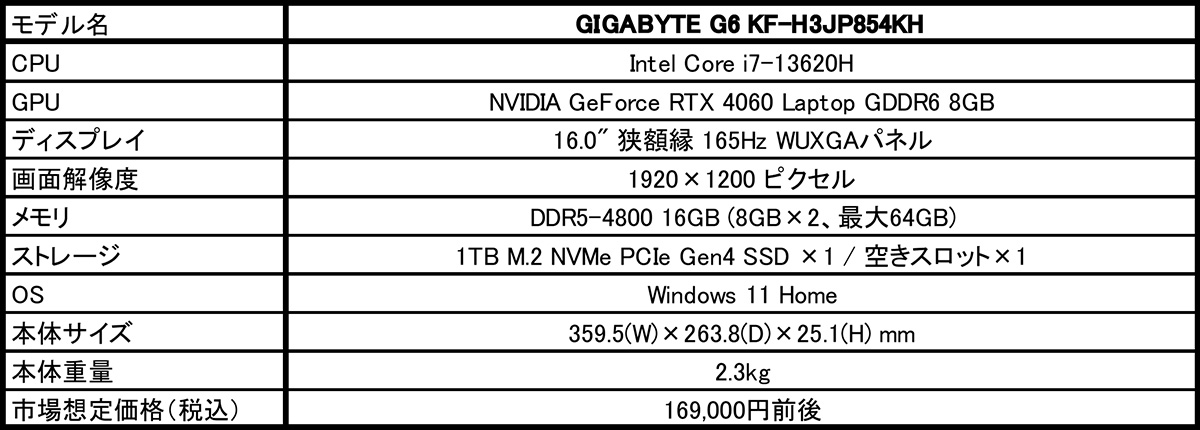 2024年11月8日 - GIGABYTE Technology Co., Ltd. 台湾・新北市 - コンピュータテクノロジーで世界をリードするGIGABYTE Technologyは、CPUに第13世代Intel Core i7プロセッサ、GPUにNVIDIA GeForce RTX 4060 Laptop GPUを搭載したエントリー向け16.0型ゲーミングノートPC「G6 KF-H3JP854KH」をGIGABYTEノートPC取扱店を通して11月9日より販売いたします。市場想定価格(税込)は、169,000円前後です。