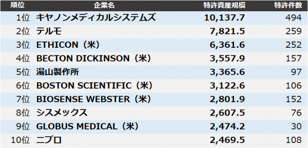 集計の結果、1位 キヤノンメディカルシステムズ、2位 テルモ、3位 ETHICON(米)となりました。