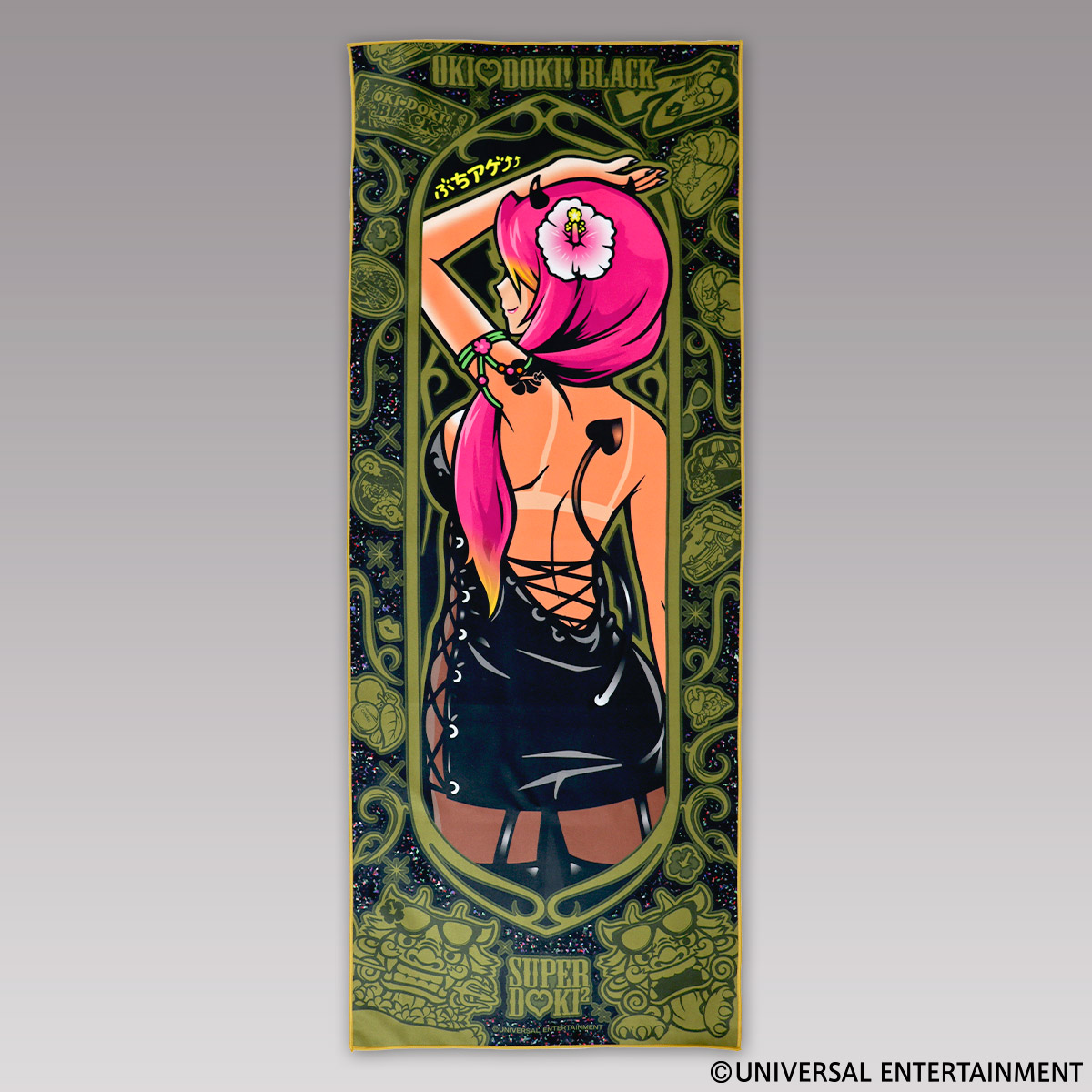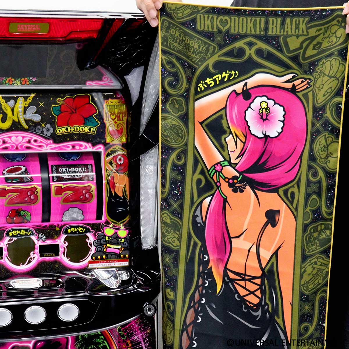 小悪魔カナちゃんを中心に「沖ドキ!BLACK」のモチーフや図柄を散りばめた、まるでアート作品のようなデザインです。