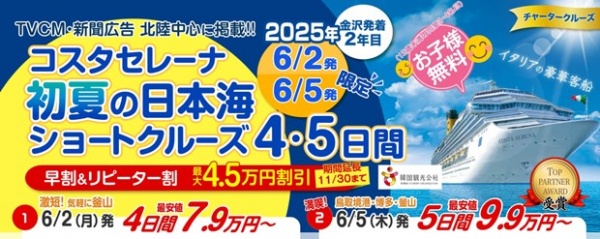 この度、多くのお客様からいただきましたご要望にお応えして、2025年6月2日出発と6月5日出発のコスタセレーナ金沢発着チャータークルーズの早割適用期間を1か月延長し、11月30日までとすることにいたしました。早割を適用することで、1名様あたり(同室2名様目まで)、内側/海側客室の場合20,000円引き、海側バルコニー客室の場合25,000円引き、ミニスイート以上の場合30,000円引きと大変お得にご乗船いただけます。ぜひ、早割適用期間内にご予約ください!