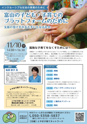 今回は、2024年11月10日(日) 吉本レディースクリニック アネックスホールにて「富山の子ども・子育てのプラットフォームのために」の講演会を開催いたします。