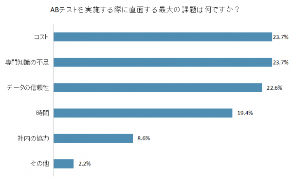 ABテスト実施における最大の壁をたずねたところ、「コスト」「専門知識の不足」が同率で23.7%、「データの信頼性」22.6%、「時間」19.4%、「社内の協力」8.6%、「その他」2.2%という結果に。コストの問題や専門知識の不足、データの信頼性などがABテストの実施を阻む要因となっていることがわかりました。