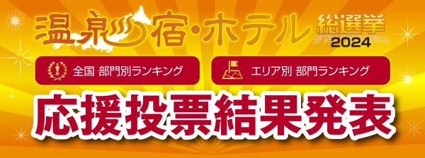 1万人以上の温泉好きの方々が応援投票した結果は、「温泉宿・ホテル総選挙2024」サイトにて全国 部門別ランキングとエリア別 部門ランキングを発表しております、是非WEBサイトにてご確認ください。