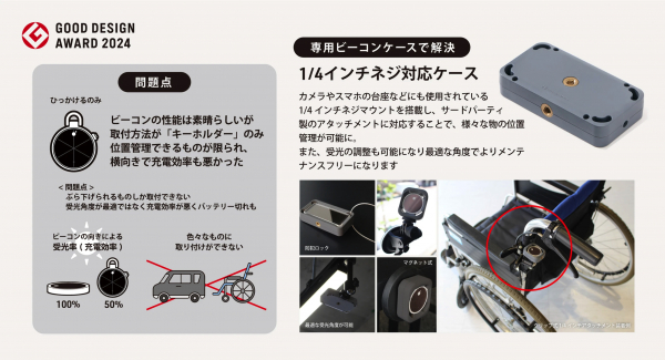 空港内のカートや医療機器等の位置管理に用いるソーラーパワービーコンのための取り付け用のアタッチメントである。ソーラーパワービーコンの性能を安定的に維持するためには、照度が確保できるよう正しい向きに取り付けられる必要があるが、本製品では1/4ねじのナットを内蔵することで、市販されている取り付けジグを利用することができ、さまざまな管理対象物への取り付けを容易にしている。防犯ワイヤ取り付けと水抜きの機能を兼ねた四隅の穴なども含めて、必要な機能が形になったデザインの好例といえる。