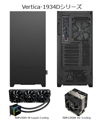 空冷のVertica-1934Dモデルでは、システム前面の吸気ファン3台とトップの排気ファン2台に12cm x 25mm 静音ファンを使用し、背面の排気ファンに12cm x 25mm PWMファンを使用して、充分な冷却と動作騒音低減を可能にしています。CPUは5本のヒートパイプを使用したヒートシックと、1000-2500 rpmで回転する12cm x 25mm PWMファンで構成され、350W≦TDPのCPUに対応するプッシュプル方式CPUクーラーで冷却されます。