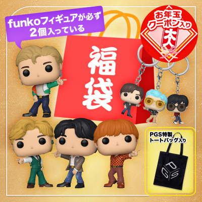 こちらのBTSの福袋には、販売価格の2~3倍相当のBTS関連商品が入り、メンバーのFunkoフィギュアが必ず2体入っています。さらに、すべての福袋にお年玉クーポン(500円 / 1,000円 / 3,000円のどれか1つ)と、PGS特製ロゴ入りオリジナルトートバッグが封入されています。