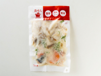 粕汁(かすじる)とは、酒粕を加えて煮込んだ汁物料理で、特に関西ではポピュラーな冬の人気メニューです。酒粕にはビタミン類やアミノ酸、炭水化物などが豊富に含まれていて、寒い時期に体を温めてくれます。今回、北海道産鮭は食べやすくほぐし身にして、他にごぼう、大根、竹輪、人参、こんにゃく、ねぎと合計7種類の具材をたっぷり使って粕汁を作りました。粕汁は一からつくると案外手間のかかるメニュー。これが湯せんで簡単に作り立ての粕汁をお楽しみいただけます。これから寒くなる季節にぴったり。体の芯から温まる一品です。まとめ買いがおすすめです。沸騰したお湯に凍った袋のまま入れ、再沸騰後、約5分間温めてください。袋を開けるとふわーっと酒粕の香りが広がります。