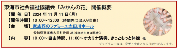 「みかんの花」とは、東海市社会福祉協議会が主催の、認知症の方やその家族を支援するつどいの場の総称です。2022年度までは東海市北部が活動の中心でしたが、2023年度より東海市南部にも活動の場を拡げ、その会場として家族葬のファミーユが「ファミーユ太田川ホール」を提供しています。2023年4月以降、これまでに通算18回実施しました。
