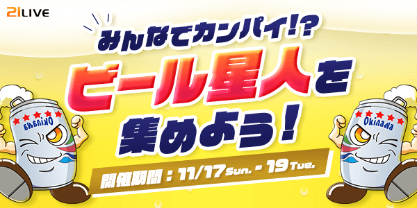 株式会社エムアンドティーティー(本社:沖縄県北谷町、代表取締役:井藤 三知子)が運営するエンターテイメント・ライブ配信アプリ【21LIVE(ニーイチライブ)】URL: https://21.live では、11月17日(日)から11月19日(火)の3日間限定イベント『ビール星人を集めよう!』を開催いたします。