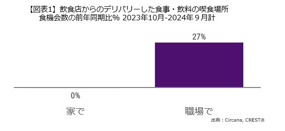2023年10月-2024年9月に飲食店からのデリバリー(デリバリーシェアサービス、代行サービスを含む)において、職場で喫飲食した食機会数は、前年同期比で27%増加しました。一方で、家での利用は、同横ばいでした。