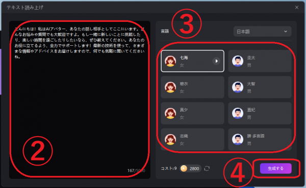 2.次にテキストボックスにテキストを入力し、AI音声のタイプを選択しましょう。その後「生成する」をクリックすると、AI音声が作成されます。