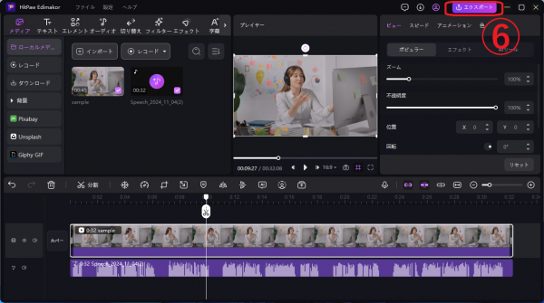 4.編集したい動画をタイムラインにドラッグアンドドロップ。すると自動的に動画と音声が重ねられます。最後に「エクスポート」をクリックし、保存して完了です。