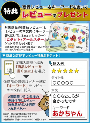 対象商品を当店でご購入の上、「商品レビュー」と「レビューの本文内にキーワード」を書くと、「Sassyビタット/オールスター」をプレゼントいたします。