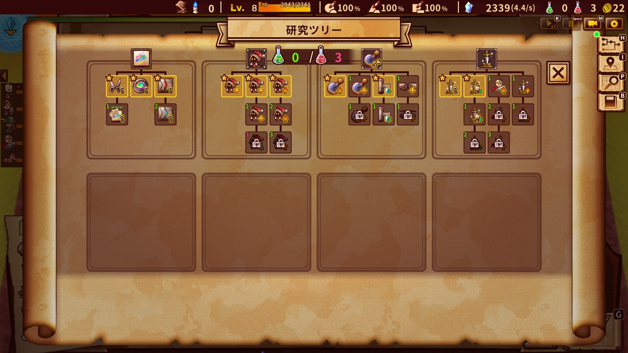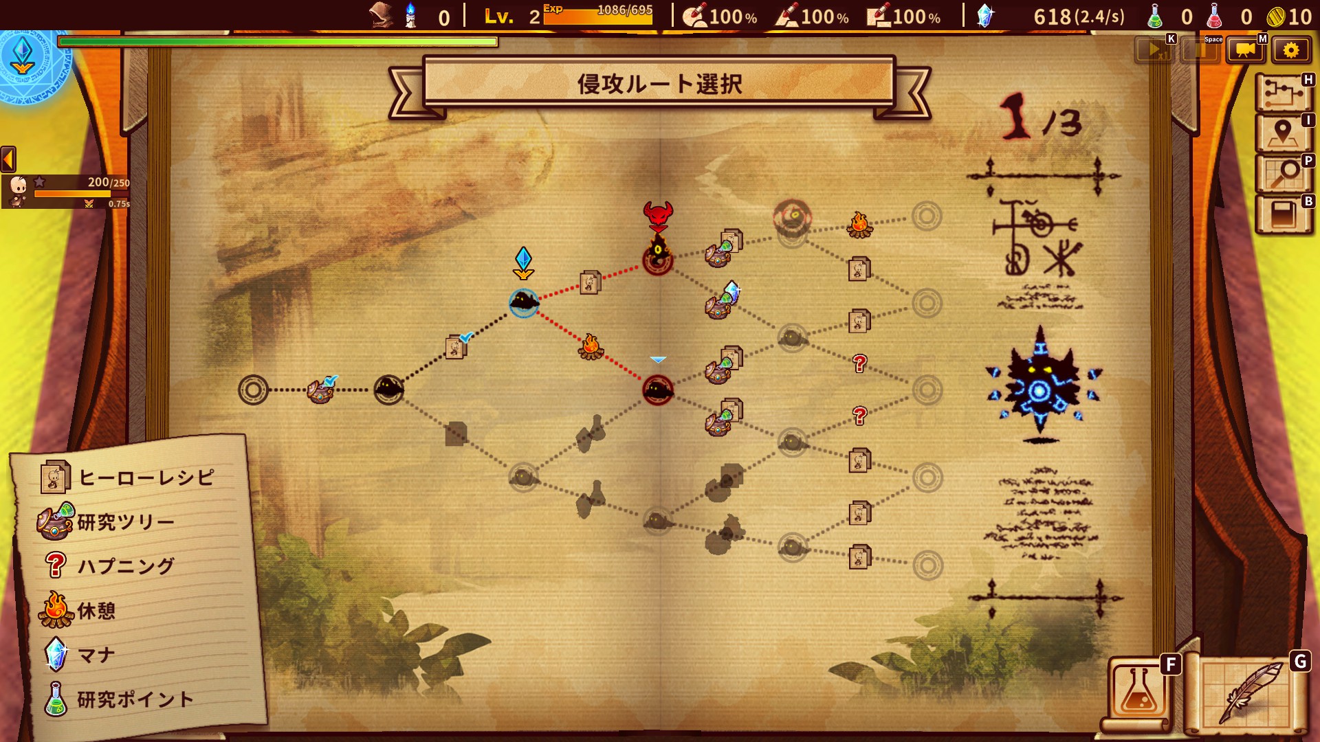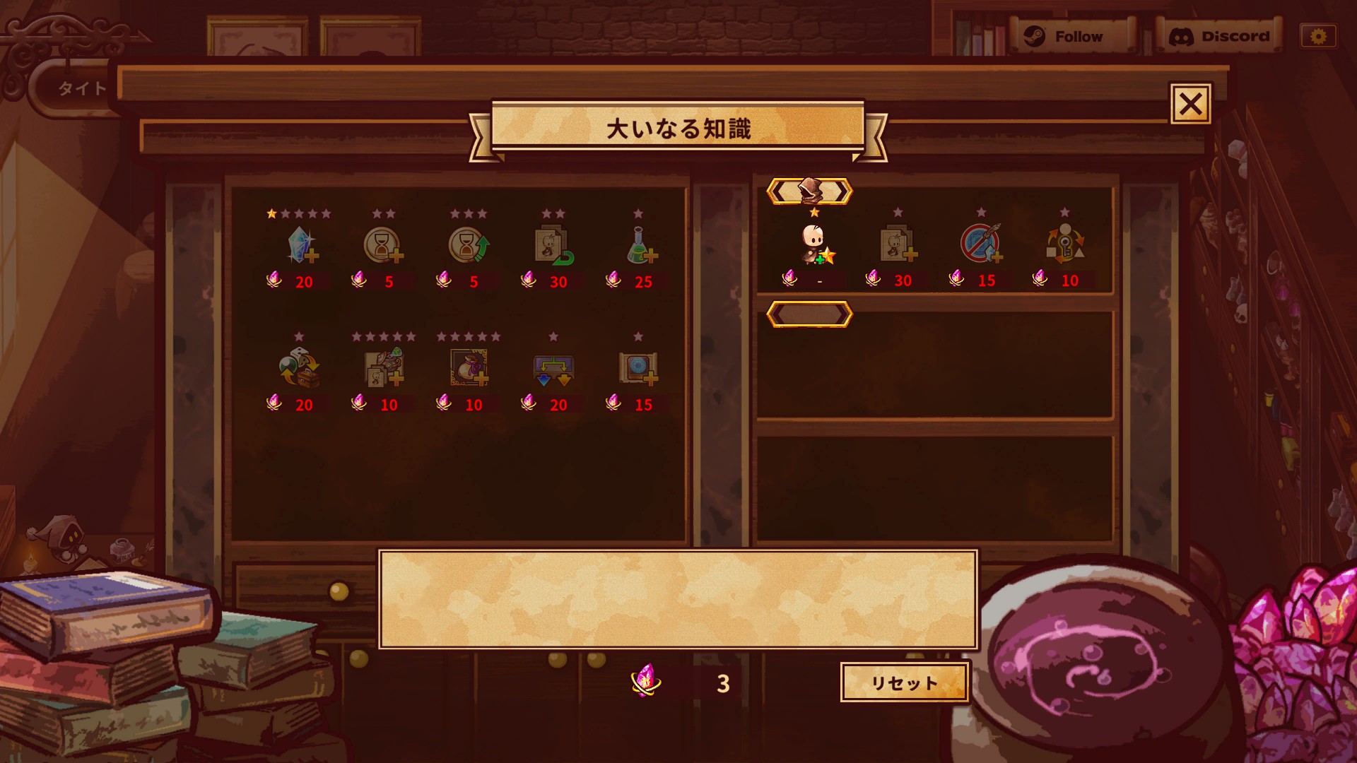体験版でその存在は公表されてきいたものの、遊ぶことができなかった「大いなる知識」。アーリーアクセスを迎え、本日ついに解禁されました。報酬として得られる“強化ポイント”を使用することで“初期マナの量+100”や“最大集中回数+1”など、恒久的な能力を手に入れることができます。