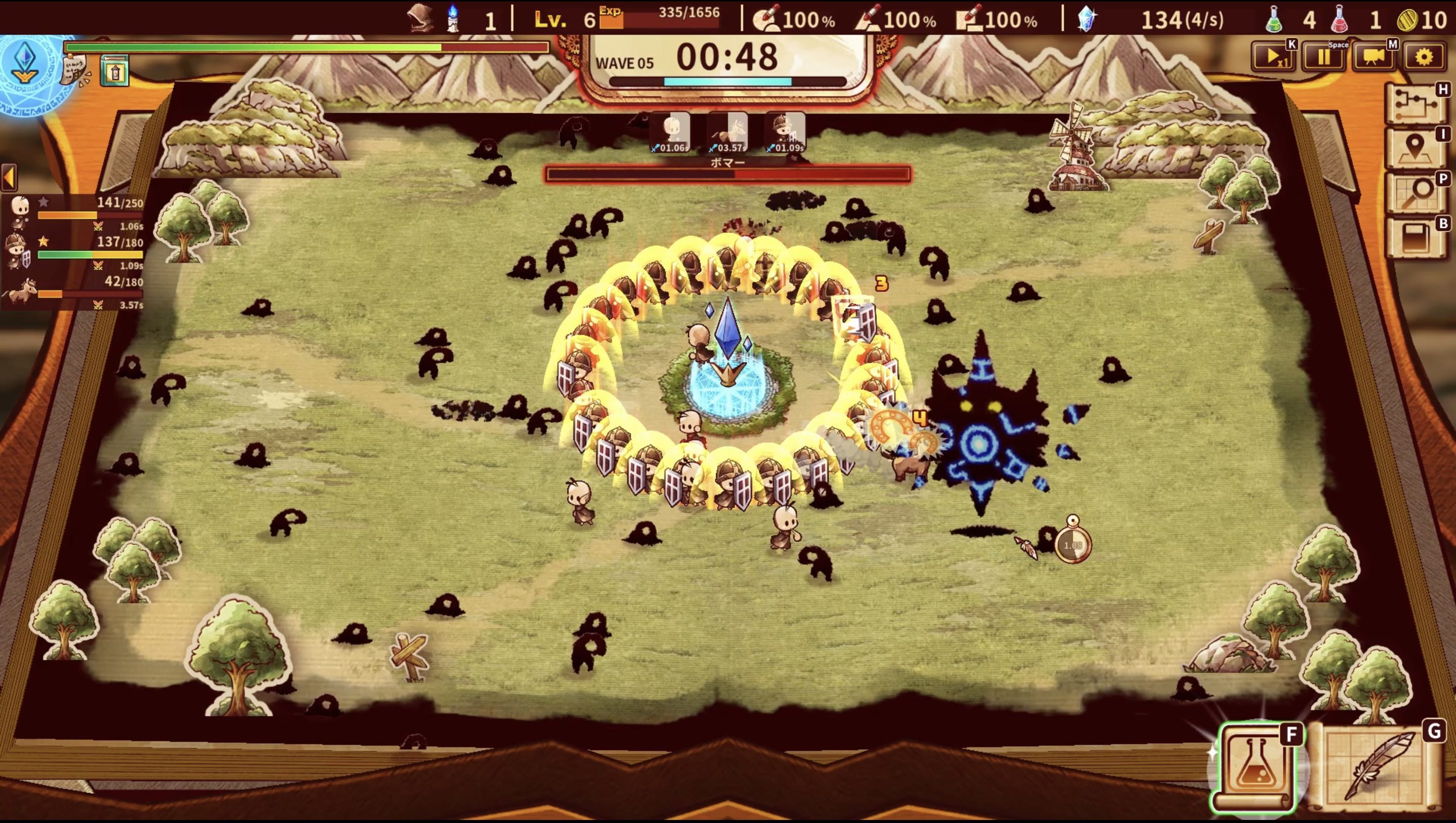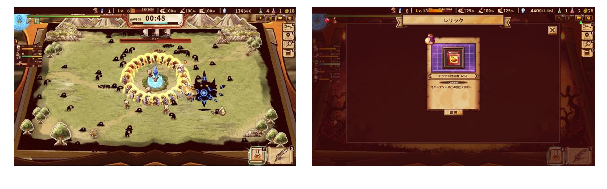 ビルドの時間が終了すると、いざバトル開始!生産してポータルに送られた“ヒーロー”たちがフィールド中央のゲートから召喚され、自動で戦ってくれます。プレイヤーも眺めているばかりではなく、マウスの左クリックで応戦することが可能です。そして見事、中央にあるゲートの破壊を阻止するとクリアとなります。報酬として工場をビルドするために必要な“マナ”やプレイヤーのレベルアップに必要なExpのほか、時にレリックなども受け取ることができます。