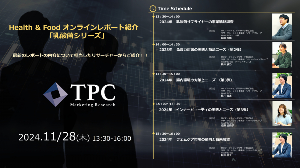 リサ・リューション事業を展開するTPCマーケティングリサーチ株式会社(代表取締役社長:松本 竜馬)は、2024年11月28日にHealth & Foodオンラインレポート紹介「乳酸菌シリーズ」を開催いたします。