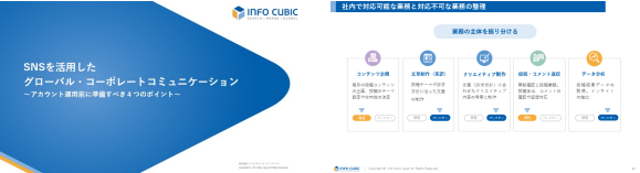 海外デジタルマーケティングの総合支援を行い1,300社以上の支援実績を持つ、株式会社インフォキュービック・ジャパン(本社:東京都新宿区、代表取締役 梅川万穂)は、令和6年11月7日(木)に、『SNSを活用したグローバル・コーポレートコミュニケーション~アカウント運用前に準備すべき4つのポイント~』 と題した、無料のホワイトペーパーを公開しました。
