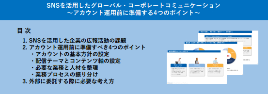グローバル企業にとって重要なステークホルダーへの情報発信。グローバル・コーポレートコミュニケーションを目的としたSNS運用は、企業の成長と信頼関係構築に向けた戦略的かつ長期的な視点が求められます。本資料では、運用方針や業務体制を構築するうえで”土台固め”となる「事前準備のポイント」を、実際の担当者がわかりやすく整理しました。柔軟で効率的な運用体制を整え、効果的なブランド戦略の基盤を築くために、ぜひ、本資料をお役立てください。