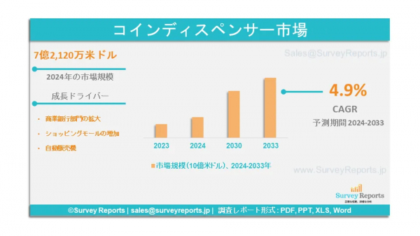サーベイレポート合同会社は、コインディスペンサー市場の予測評価を提供する調査レポート「コインディスペンサー市場のセグメンテーション;製品タイプ別(携帯型コインディスペンサー、固定型コインディスペンサー);用途別(駐車場、ヴェンディング、レジャー、その他)-世界市場分析、動向、機会、予測、2024-2033年」を2024年11月に発行したと発表した。コインディスペンサー市場の成長促進要因、市場機会、課題、脅威など、いくつかの主要な市場ダイナミクスを紹介している。