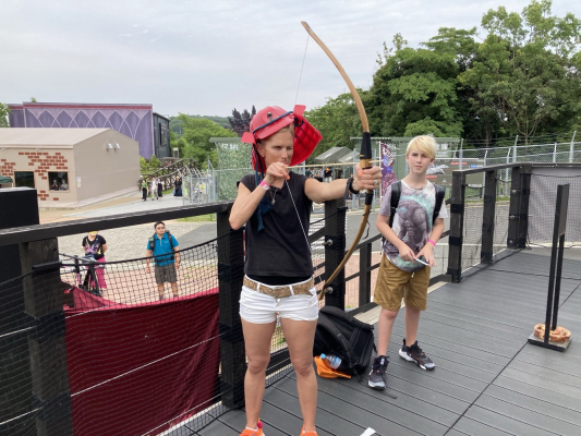 (1)「弓矢チャレンジ」/ゴジラ迎撃作戦のストーリーになぞらえて、弓矢でゴジラの的当てに挑戦するゲーム