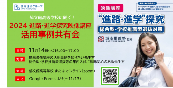 株式会社城南進学研究社(本社:神奈川県川崎市、代表取締役社長CEO:下村 勝己、以下「当社」)は、2024年11月14日(木)、高校の先生や教育関係者様を対象に、『進路・進学探究映像講座(総合型・学校推薦型選抜対策)活用事例共有会』を私立郁文館高等学校(東京都文京区)並びにオンラインにて開催します。