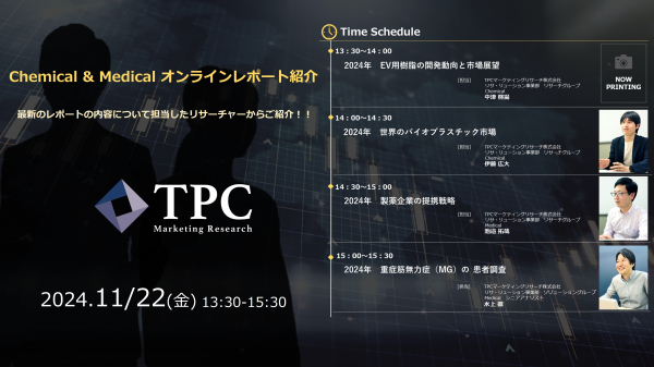 リサ・リューション事業を展開するTPCマーケティングリサーチ株式会社(代表取締役社長:松本 竜馬)は、2024年11月22日にChemical & Medical オンラインレポート紹介を開催いたします。