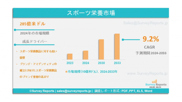 Surveyreportsの専門家はスポーツ栄養市場の調査を分析し、2024年にスポーツ栄養市場規模が285億米ドルに達すると予測した。さらに、スポーツ栄養市場のシェアは、2033年末までに649億米ドルに達すると予測されている。スポーツ栄養市場は、2024年から2033年の予測期間にわたって、年間平均成長率(CAGR)約9.2%で成長すると予測されている。