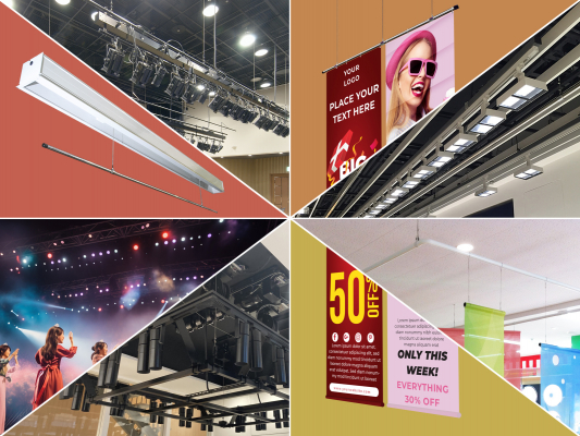 「照明バトン」は、照明器具(ショップ用ライト、ホリゾントライト、サスペンションライト、パーライト等)の吊り下げに特化した□型角パイプの吊元形状と便利な付属品を標準装備した電動昇降装置です。バトンの最大昇降ストローク長+5mの電源ケーブルリールを装備していて、ケーブルリールに電源をつなぎこむことでメンテナンス可能なライティング設備構築ができます。スポットライトなどの照明器具を取り付けられるレール状の配線ダクトレールも標準装備しています。ご希望の照明器具を購入していただくだけで、照明高さを任意で変えられるライティング設備としてすぐに利用可能です。最大吊荷重250kgfまでの仕様品も用意していますので、大型の照明設備も安心して利用できます。