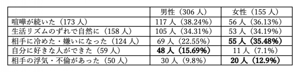 3番目に多かった「相手に冷めた・嫌いになった」は、女性の回答割合が男性を大きく上回る結果に。「好きな人ができた」は男性の回答割合が高くなり、反対に「相手の浮気・不倫があった」は女性の回答割合が高くなりました。