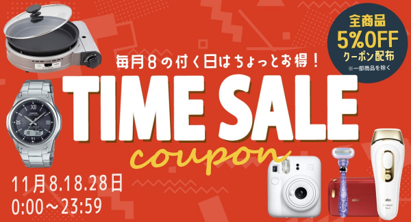 セール対象商品をご購入いただくと、購入金額より5%OFFされるクーポンを発行いたします。